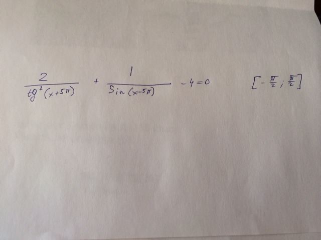 frac{2}{tg^2(x+5pi )}+frac{1}{sin^2(x-5pi )}-4=0\\frac{1}{tgx}=ctgx; to frac{1}{tg^2x}=ctg^2x\\tozdestvo:; 1+ctg^2x=frac{1}{sin^2x}\\tg(x+5pi )=tgx\\sin(x-5pi )=-sin(5pi -x)=-sinx\\sin^2(x-5pi )=(-sinx)^2=sin^2x\\to ; ; 2ctg^2x+1+ctg^2x-4=0\\3ctg^2x=3