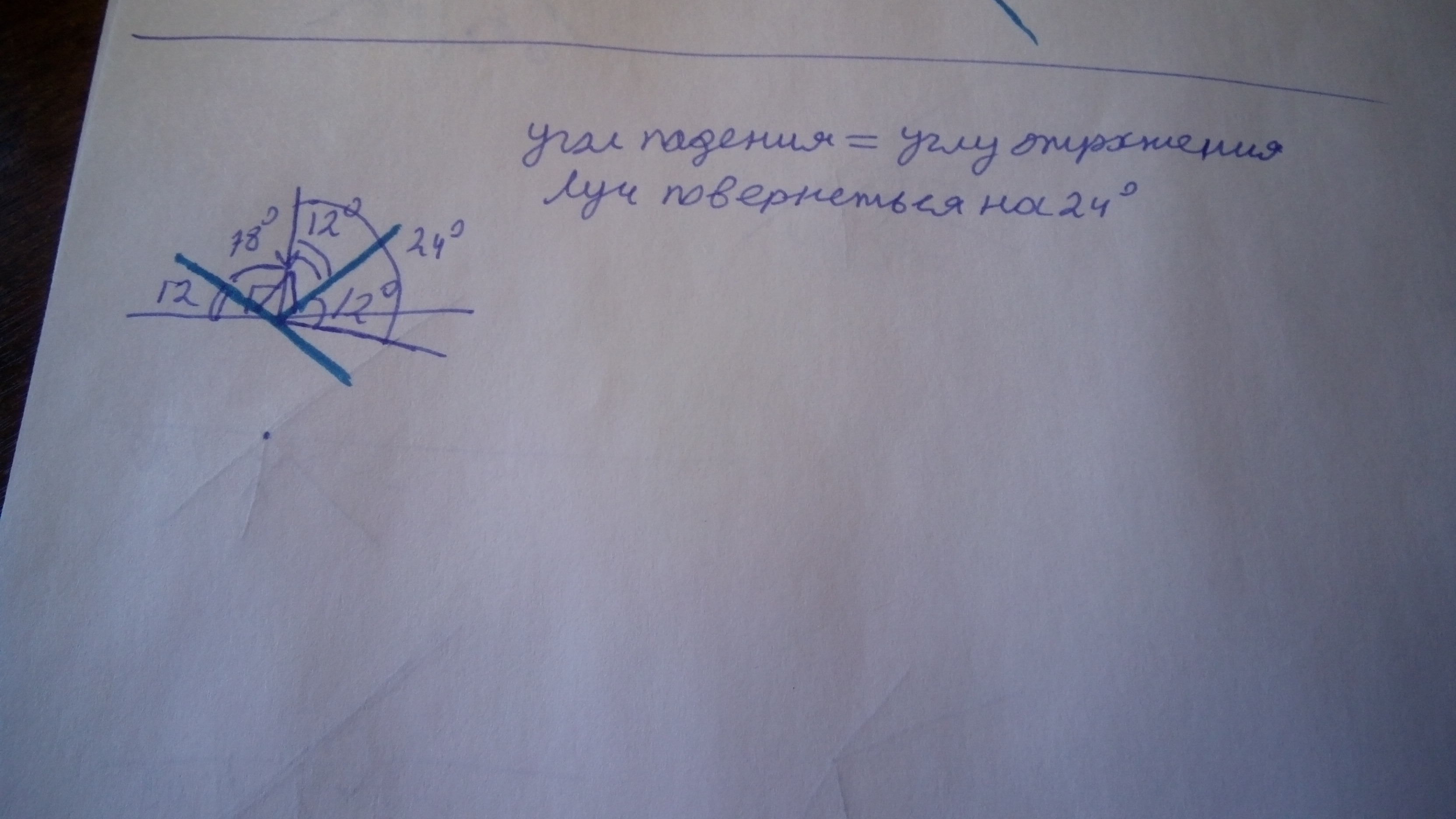 Луч света падает на зеркало перпендикулярно. На какой угол отклонится отраженный луч от падающего, если зеркало повернуть на угол 12°?