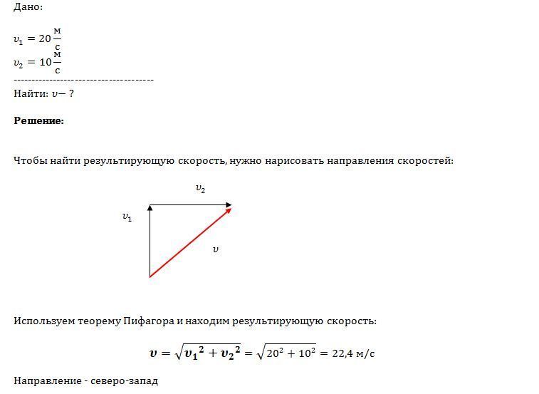Вертолет летел на север со скоростью 20м/с. С какой скоростью будет лететь вертолет, если подует западный ветер со скоростью 10м/с?