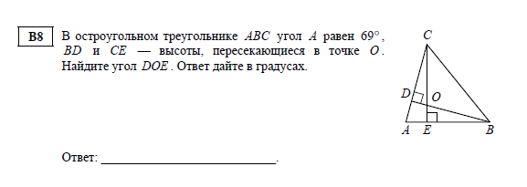 Рассмотрим АСЕ. Угол А=69, угол АЕС=90, значит АСЕ=180-(69+90)=21, это тот же угол DCO в треугольнике DCO. Угол СDO=90, следовательно, СОD=180-(90+21)=69. COD смежный с DOE, следовательно, DOE=180-69=121 градус