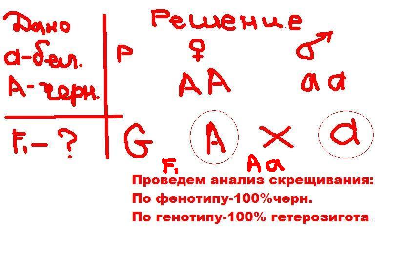 Белый кролик (aa) скрещивается с чёрным кроликом (АА). Гибридные кролики скрещиваются между собой. Какое потомство у них получится?