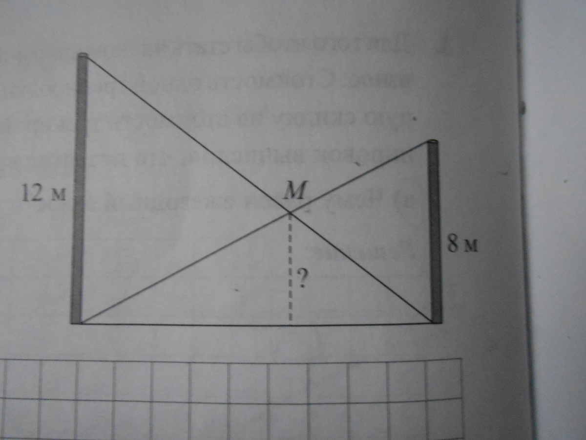 Две верёвки привязаны к двум вертикальным столбам так, что один конец каждой из них присоединён к вершине одного столба, а другой- к основанию второго столба. На каком расстоянии от поверхности земли находится точка M пересечения верёвок, если высота столбов соответственно равна 12м и 8м?