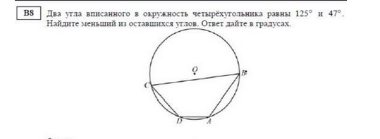 1)Сумма противоположных углов вписанного четырехугольника равна 180 градусов. Пусть угол А равен 125. Тогда противолежащий угол в 180-125=55 градусов. Если угол B равен 47, то угол D равен 180-47=133.Ответ: 55
