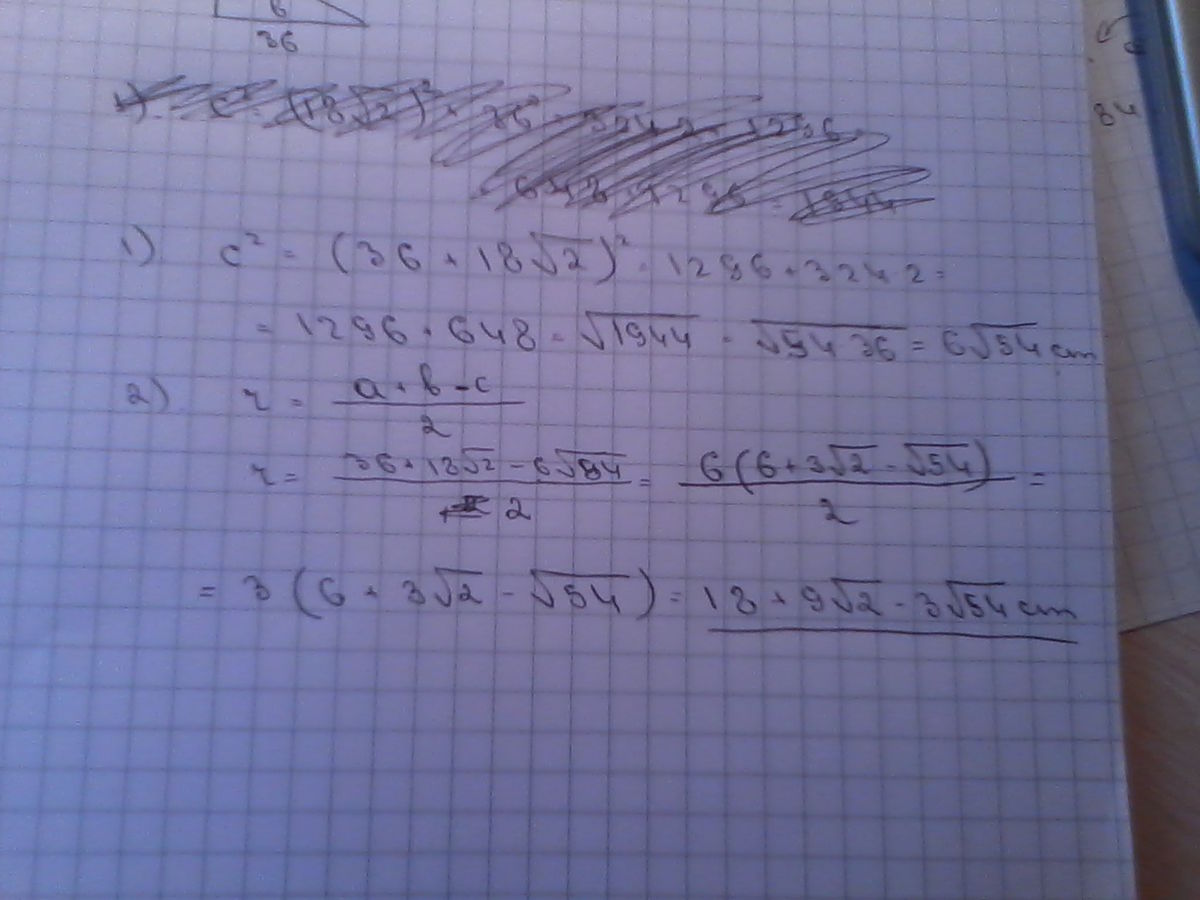 катеты равнобедренного прямоугольного треугольника равны 36+18 корней из 2 найдите радиус вписанной окружности