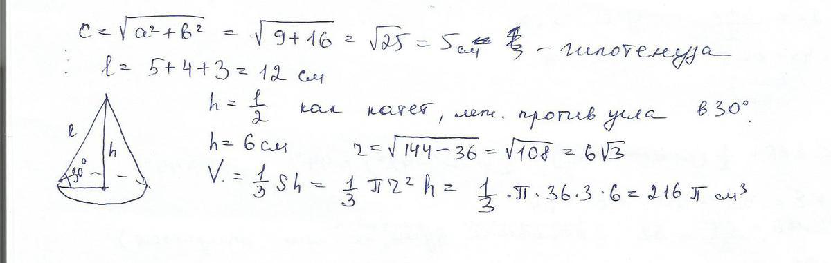 Образующая конуса равна периметру прямоугольно треугольника с катетами 3 и 4 см наклонена к основанию конуса на угл 30 градусов. Найти: объём.