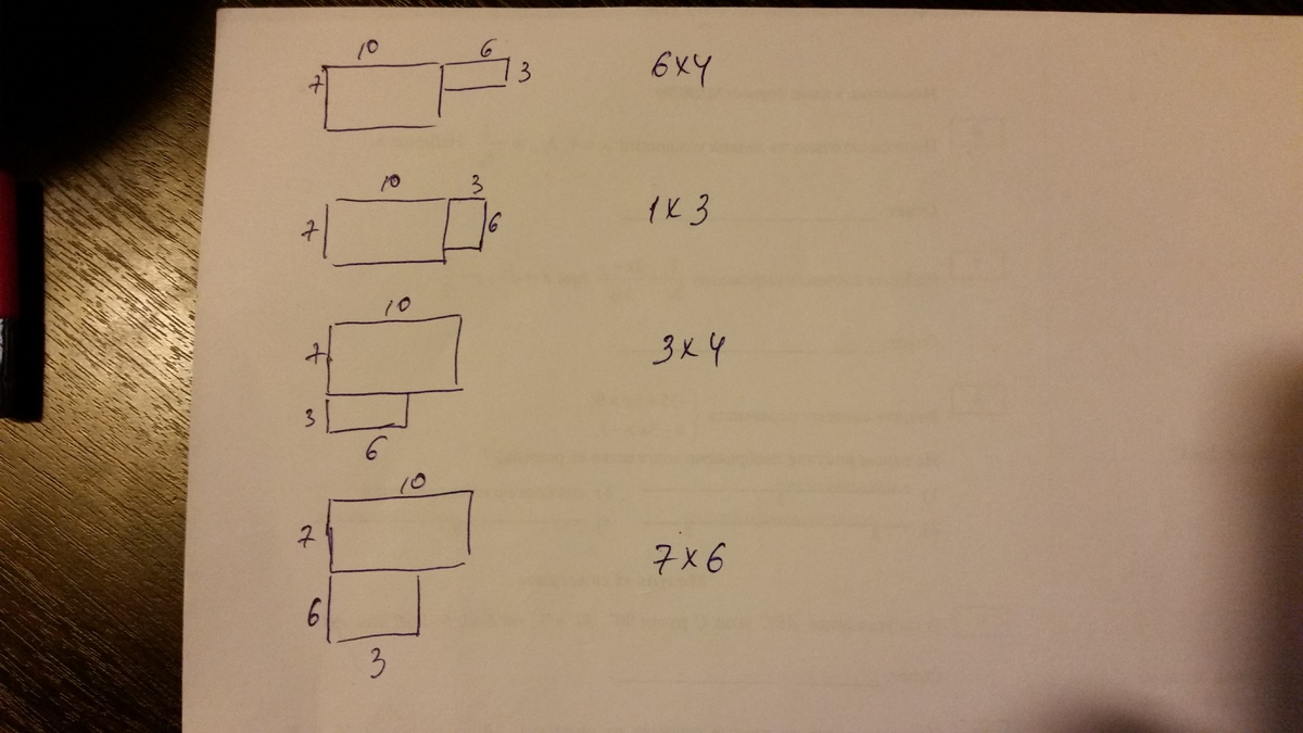Прямоугольник разрезали на три прямоугольника, два из которых имеют размеры 710 и 36. Какие размеры мог иметь третий прямоугольник? Перечислите все возможности.