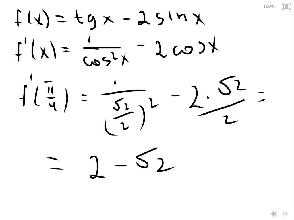 Найдите значение производной функции f(x)=tgx-2sinx при x= -(Пи/4)