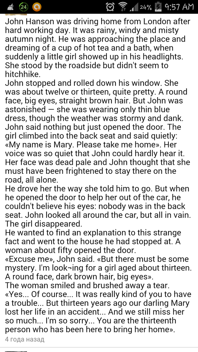 John Hanson was driving home from London. He was very tired after a hard working day. Suddenly he saw a young girl standing by the roadside. John stopped and without the word opened the door of the car to invite a girl inside. She climbed into a back seat and asked to take her home. When John drove to the required house the girl dissapeared. He asked a woman in the house to give him an explanation to this strange fact. It appeared that the girl had lost her life in an accident 13 years ago. That girl by the roadside wasn't alive, that was only her soul.