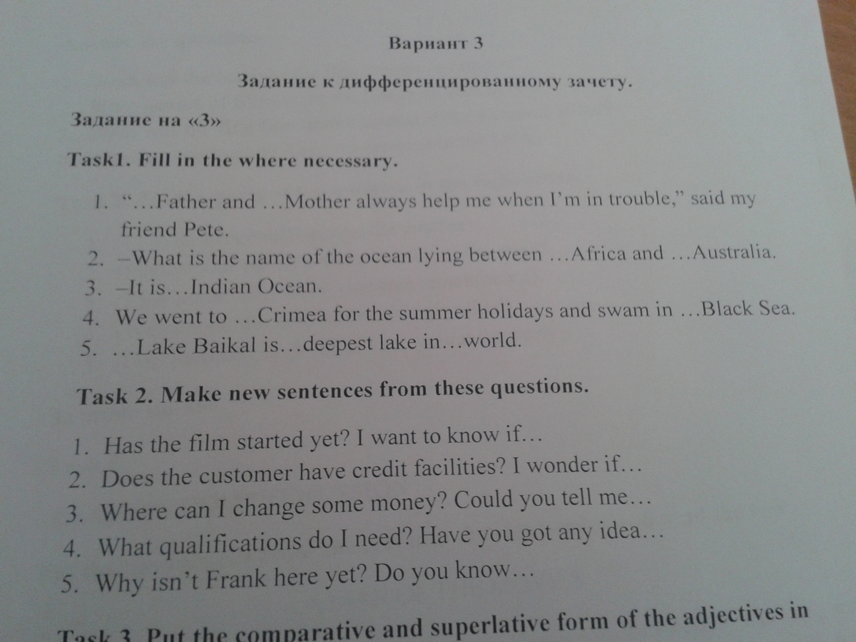 Артикль нужен в 3 предложении: the Indian Ocean, в 4 предложении the Crimea, the Black Sea, в 5 предложении the deepest lake in the world