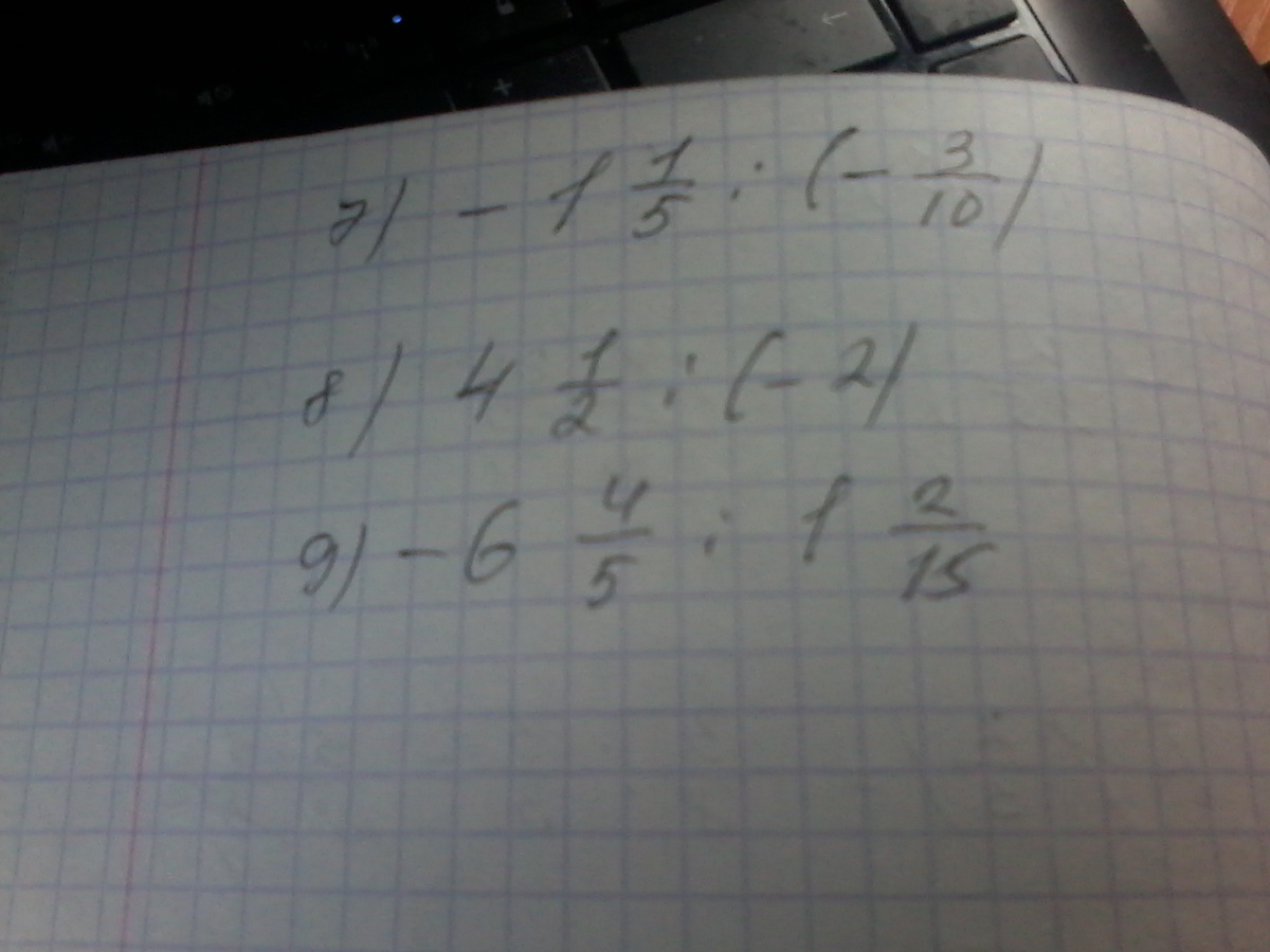 2/3*1/9=18/3=6,знак +,так как при уножении минус на минус даёт + 2)7/8*1/14=1/16 3)3/5*2/3=2/5 4)7:(-3)=-7/3=-2 1/3 5)-4:(-2/3)=4*3/2=6 6)-2: (-1 1/3=32=1 1/2 1)-8 3/4-6 1/2=-2 1/4 2)-2 1/4:1/8 =-9/4*8/1=72/4=-18 3)- 18-11 3/7=6 4/7