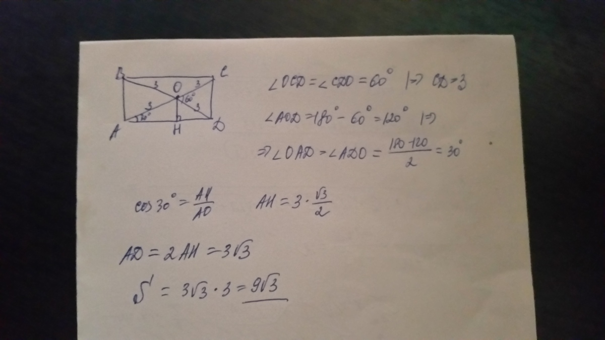 Дан прямоугольник ABCD, в котором O - точка пересечения диагоналей, OC = 3 cм, а m (<COD)= 60 градусов. Найди площадь прямоугольника ABCD.
