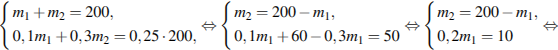 Имеется два сплава. Первый сплав содержит 10% никеля, второй – 30% никеля. Из этих двух сплавов получили третий сплав массой 200 кг, содержащий 25% никеля. На сколько килограммов масса первого сплава меньше массы второго? Пусть масса первого сплава кг, а масса второго – кг. Тогда массовое содержание никеля в первом и втором сплавах и , соответственно. Из этих двух сплавов получили третий сплав массой 200 кг, содержащий 25% никеля. Получаем систему уравнений: