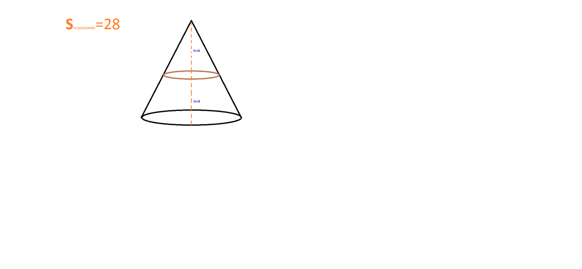 Площадь основания конуса равна 28. Плоскость, параллельная плоскости основания конуса, делит его вы со ту на равные отрезки длиной 4 и 4. Найдите площадь сечения конуса этой плоскостью.
