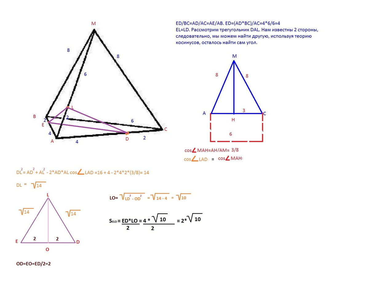 , а боковое ребро равно 8. На ребре АС находится точка D, а ребре АВ находится точка Е, а на ребре АМ - точка L. Известно, что CD = ВЕ = AL = 2. Найдите площадь сечения пирамиды плоскостью, проходящей через точки Е, D, L