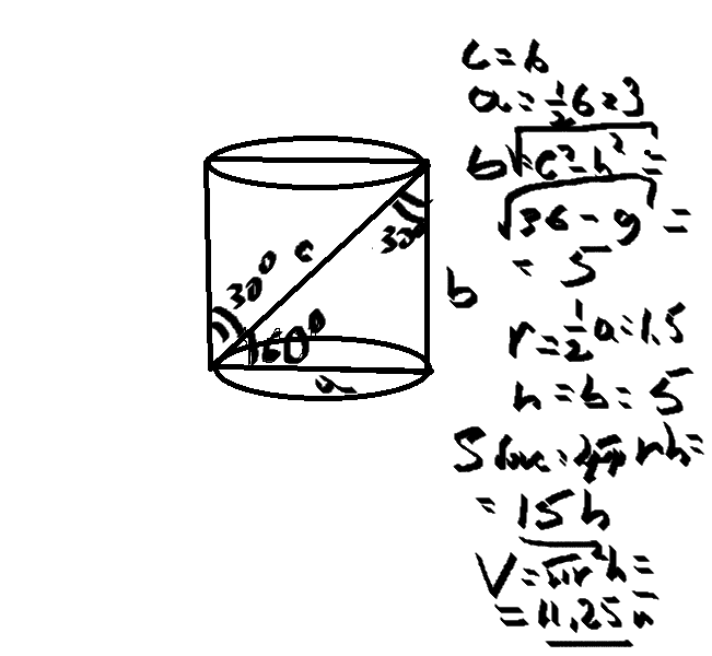 В осевом сечении цилиндра диагональ образует с плоскостью основания угол 60*. Найти площадь поверхности и объем цилиндра, если диагональ осевого сечения 6 см.