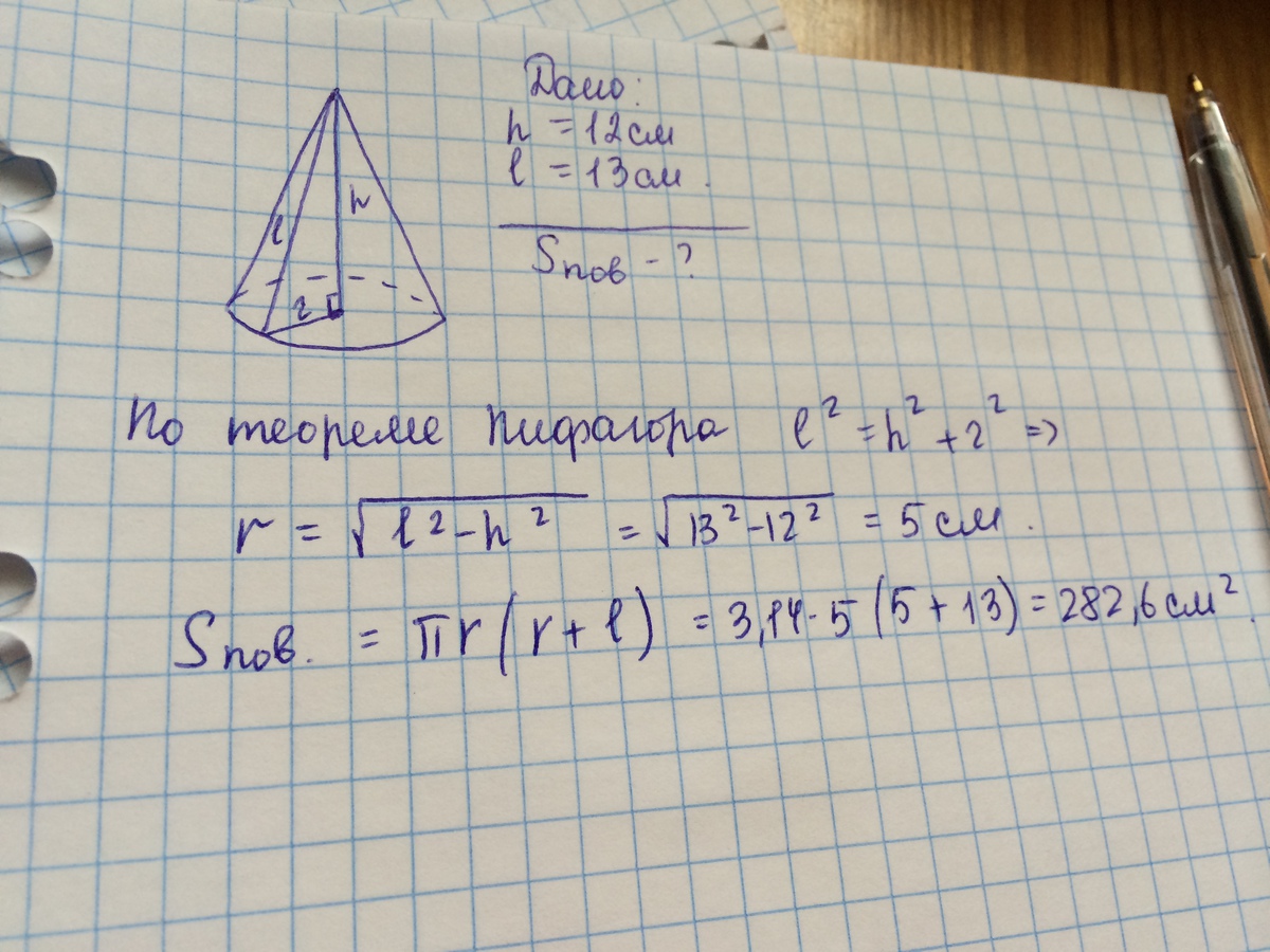 По теореме Пифагора находим радиус, площадь полной поверхности конуса определяется по формуле Sпов=пи*r(r+l)