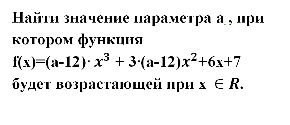 При а=12, f = 0*x^3 + 3*0*x^2 + 6x + 7 = 6x + 7 - прямая, возрастает на всей числовой оси.
