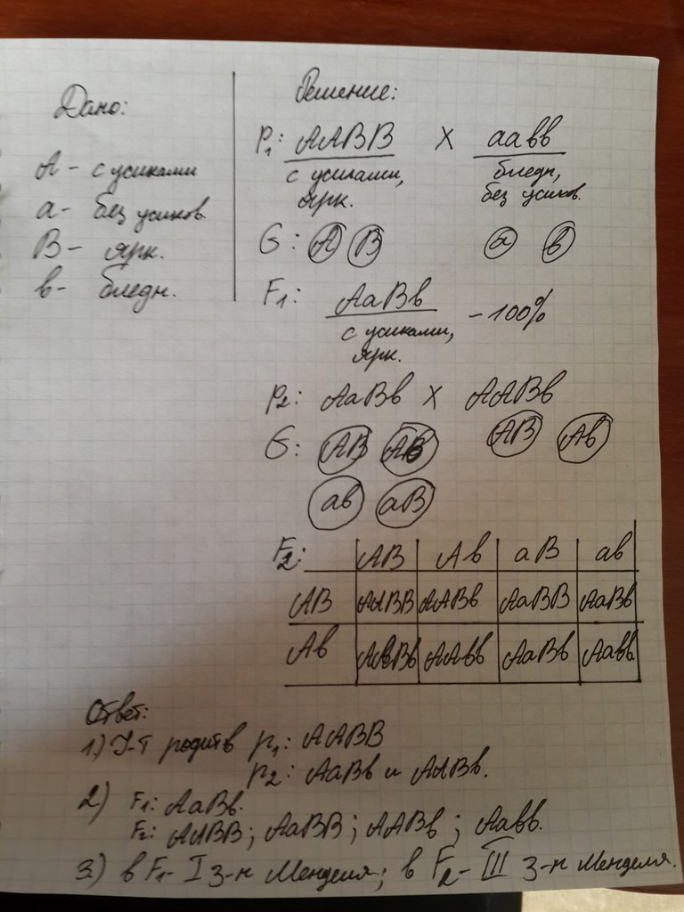При скрещивании растения душистого горошка с усиками и яркими цветками и растения без усиков и с бледными цветками в F1 все растения были с усиками и яркими цветками. От скрещивания гибрида из F1 и растения с усиками и яркими цветками были получены растения с двумя фенотипами: с усиками и яркими цветками; с усиками и бледными цветками. Составьте схему решения задачи. Определите генотипы родителей, потомства F1 и F2. Какие законы наследственности проявляются в F1 и F2?