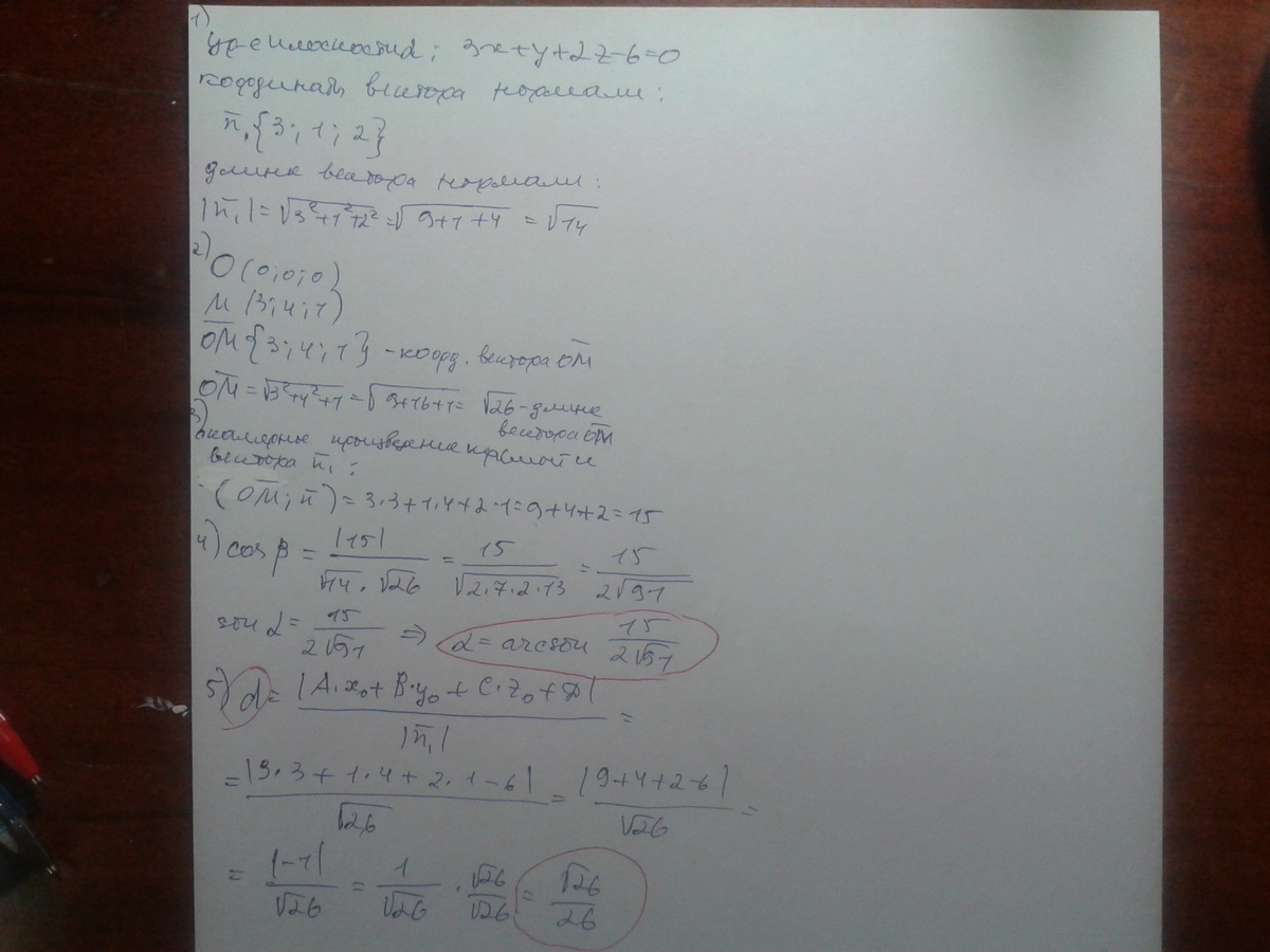 Найти угол между плоскостью а: 3x+y+2z-6=0 и прямой, проходящей через начало координат и точку М(3,4,1). Вычислить расстояние от точки М до плоскости а.