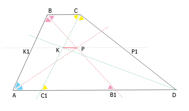 AD и BCоснования трапеции ABCD, P- точка пересечения биссектрис углов DAB и АВС, К- точка пересечения биссектрис углов BCD и CDA. Найдите длину средней линиитрапеции, если AB=4, CD=10, PK=1.