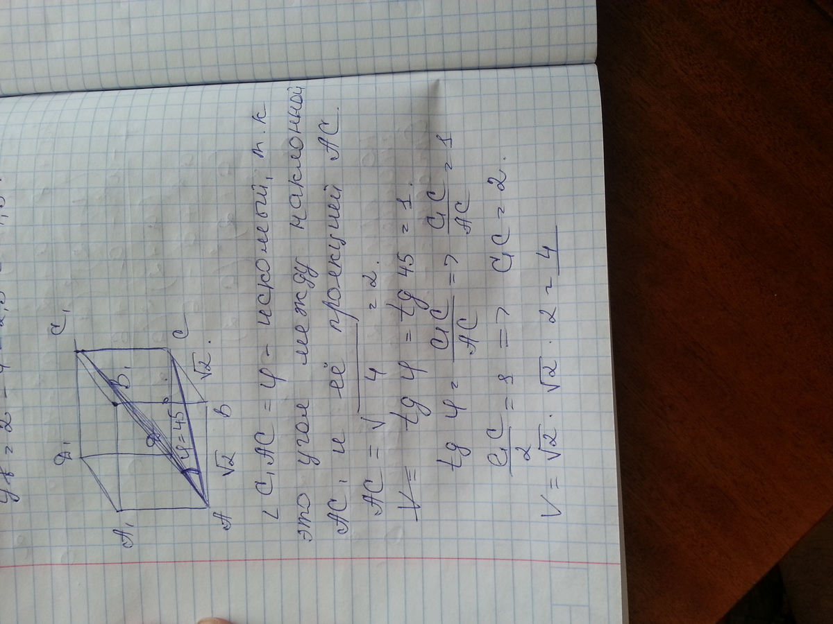 Основанием прямоугольного параллелипипеда служит квадрат со сторонами , равными корень из 2 . Найти объем этого параллелипипеда если его диагональ образует с плоскостью основания угол 45 градусов .. ( с решением и с рисунком желательно)