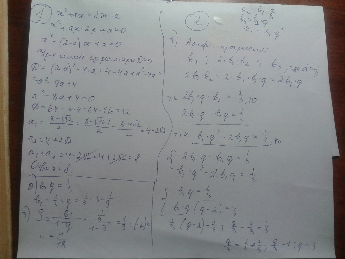 2.Найдите сумму бесконечно убывающей геометрической прогрессии, второй член которой, удвоенное произведение первого члена на четвертый и третий член в указанном порядке образуют арифметическую прогрессию с разностью 1/3.(Пожалуйста, напишите дано, так как я не понимаю задачу вообще).