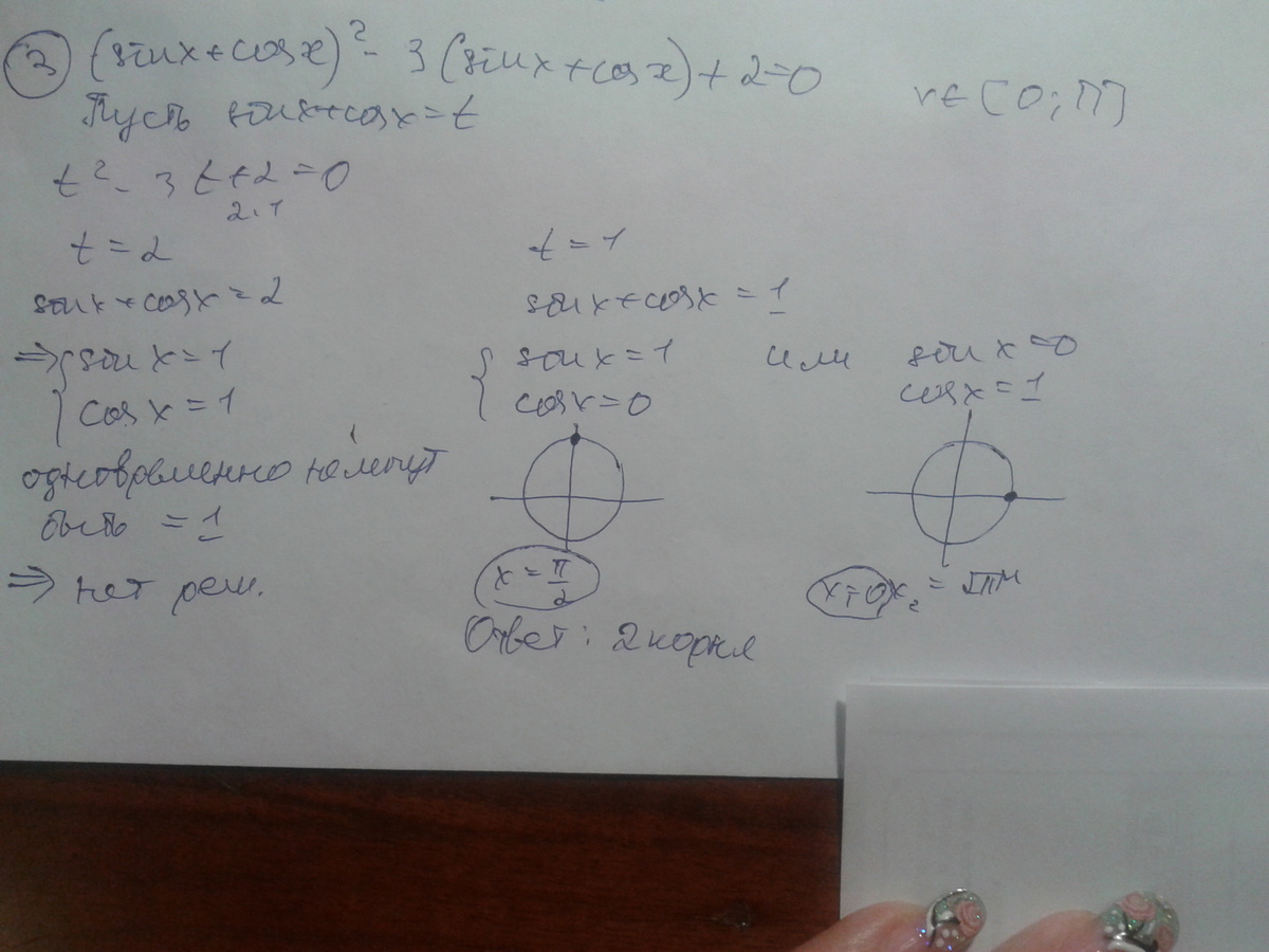 3) (sinx+cosx)^2 -3(sinx+cosx)+2=0 (найти количество корней на [0;п])