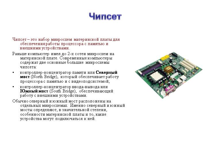 Чипсет- это набор микросхем материнской платы для обеспечения работы процессора с памятью и внешними устройствами