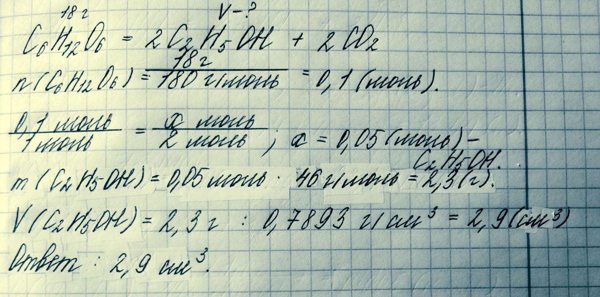 Какой объем этилового спирта образуется при брожжении 18 г глюкозы если реакция протекает по следующему уровнению?