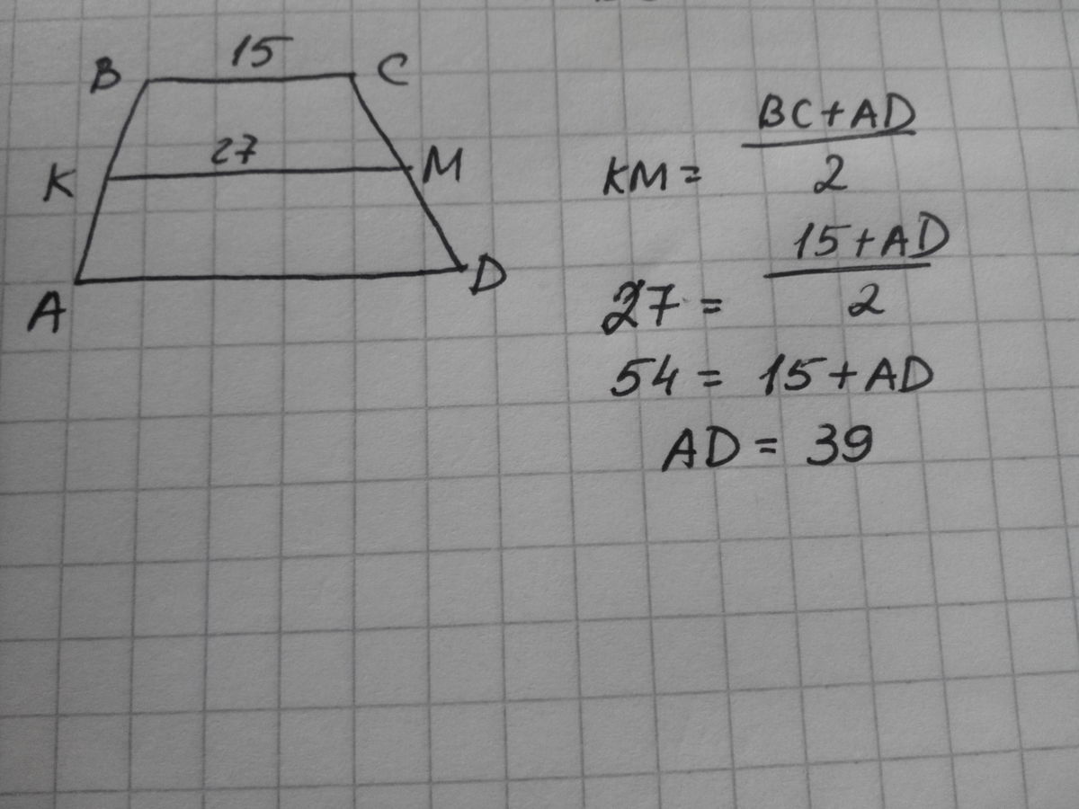 В трапеции одно из оснований равно 15 , а средняя линия трапеции равна 27 .Найдите другое основание трапеции.