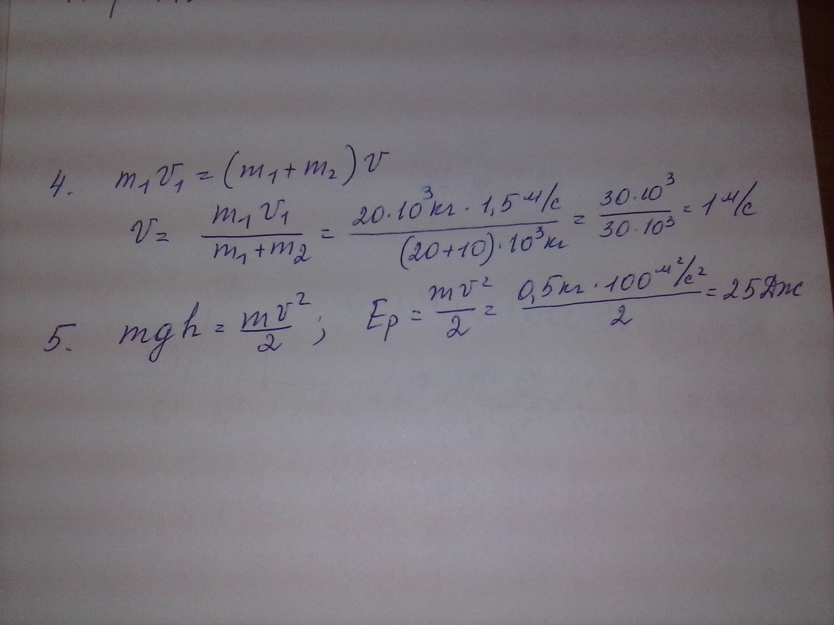4. Вагон массой 20 т движется со скоростью 1, 5 м/с и сталкивается с платформой массой 10 т. Определите скорость их совместного движения.