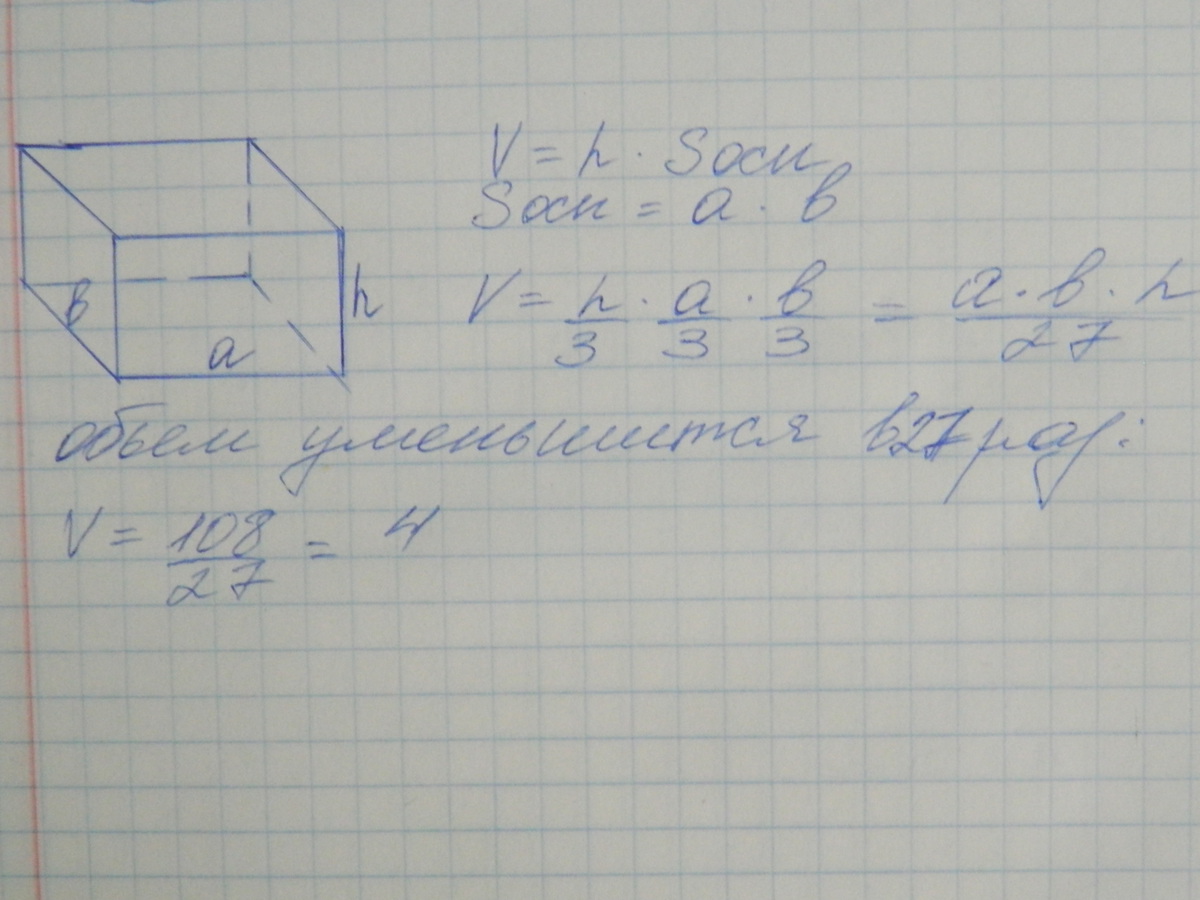 Объем прямоугольного параллелепипеда равен 108. Чему будет равен объем параллелепипеда, если каждое его ребро уменьшить в три раза??