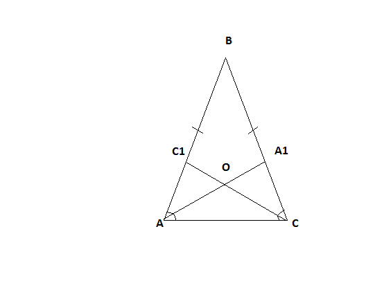 Т.к. <BAC=<BCA и АА1, СС1 - биссектрисы, то <A1AC=<C1CA. Это - углы при основании АС треугольника АОС. Поскольку углы при основании равны, то треугольник АОС - равнобедренный.