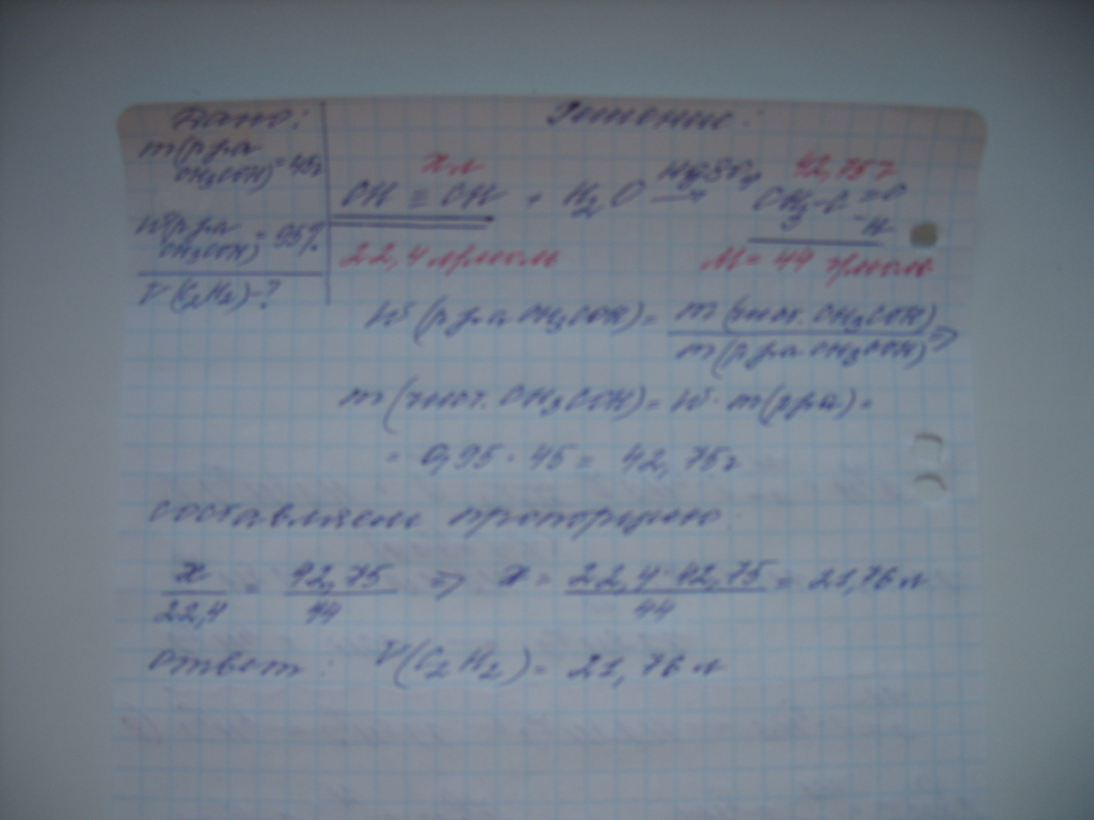 Какой объем ацетилена необходим для получения уксусного альдегида в виде 95%-ного раствора массой 45 г
