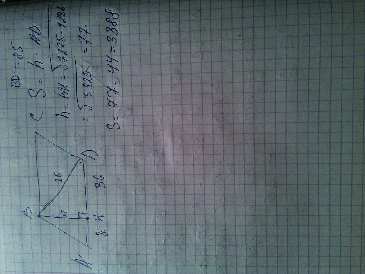 Высота ВH параллелограмма АВCD делит его сторону АD на отрезки АH-8 и НD-36. Диагональ параллелограмма ВD равна 85 . Найдите площадь параллелограмма.