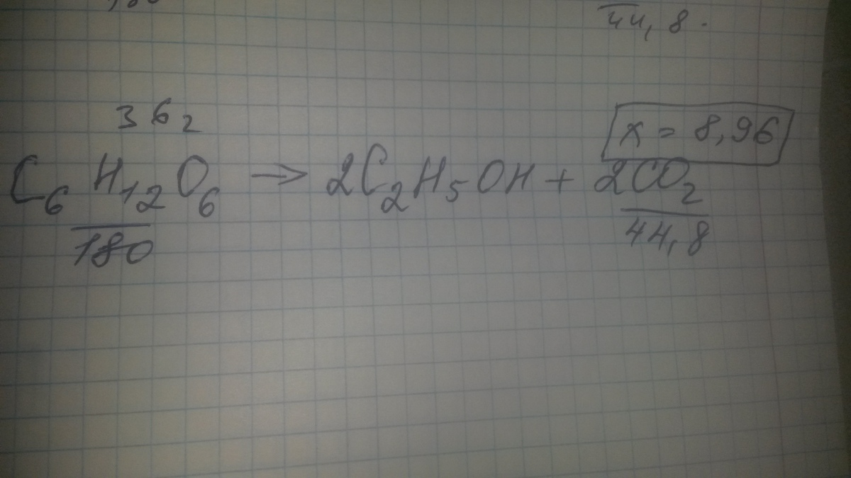 C6H12O6→2C2H5OH +2CO2. Под глюкозой пишем Mr сверху 36г. а Co2 берем в литрах, 44.8. ответ будет 8.96