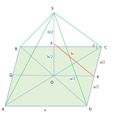 Боковое ребро правильной четырехугольной пирамиды образует с плоскостью основания угол β Отрезок соединяющий середину высоты пирамиды и середину бокового ребра равна в. найдите объем пирамиды
