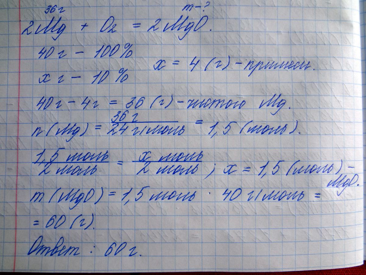 Вычислите массу оксида магния, получающегося при горении 40 грамм магния, содержащего 10% примесей.