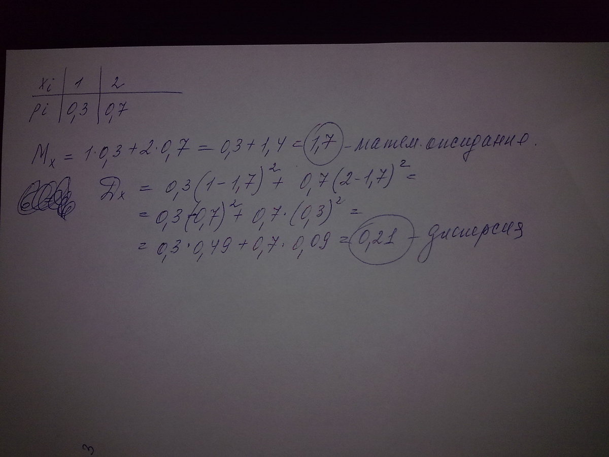 Производится 3 выстрела с вероятностями попадания в цель, равными соответственно 0.7;0.7;0.3. Найти математическое ожидание и дисперсию числа попаданий.