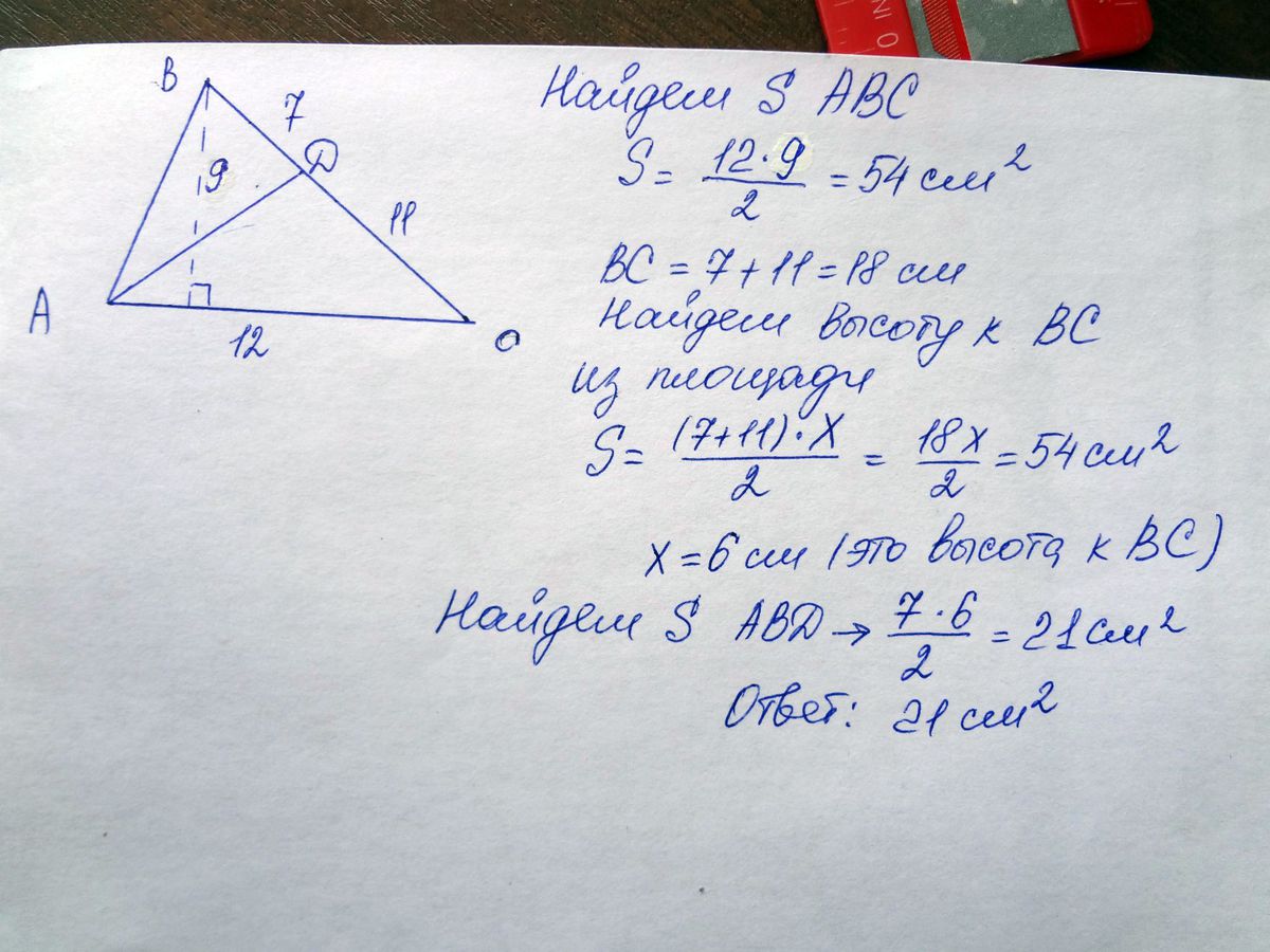 в треугольнике АВС АС=12см, высота ВH=9 . На стороне BC взята D так, что ВD : DС= 7 : 11. Найдите площадь треугольника ABD