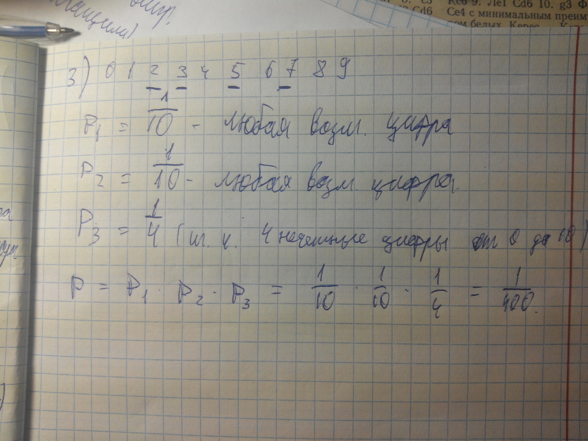 3) Владелец пластиковой карты банкомата забыл последние 3 цифры кода и набрал их наугад. Какова вероятность набора верного номера,если известно,что последняя цифра нечетная?