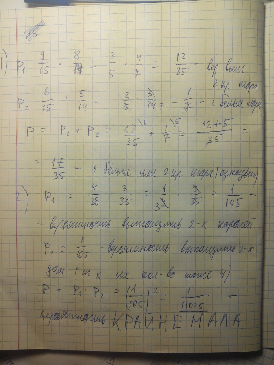 1) В ящике 9 красных и 6 белых шаров. Вытаскивают наудачу 2 шара. Найти вероятность того,что шары будут одноцветными?