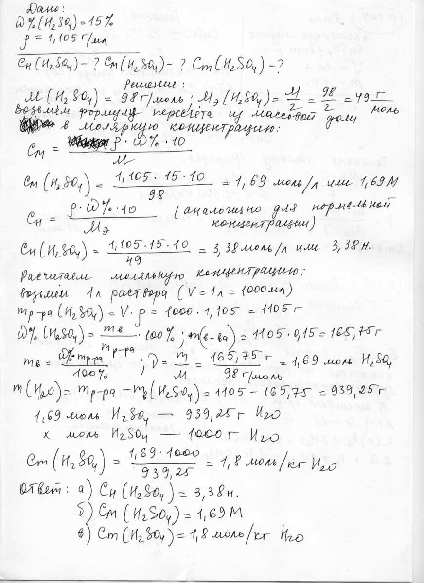 . Плотность 15%-ного (по массе) раствора H2SO4 равна 1,105 г/мл. Вычислить: а) нормальность; б) молярность; в) моляльность раствора.