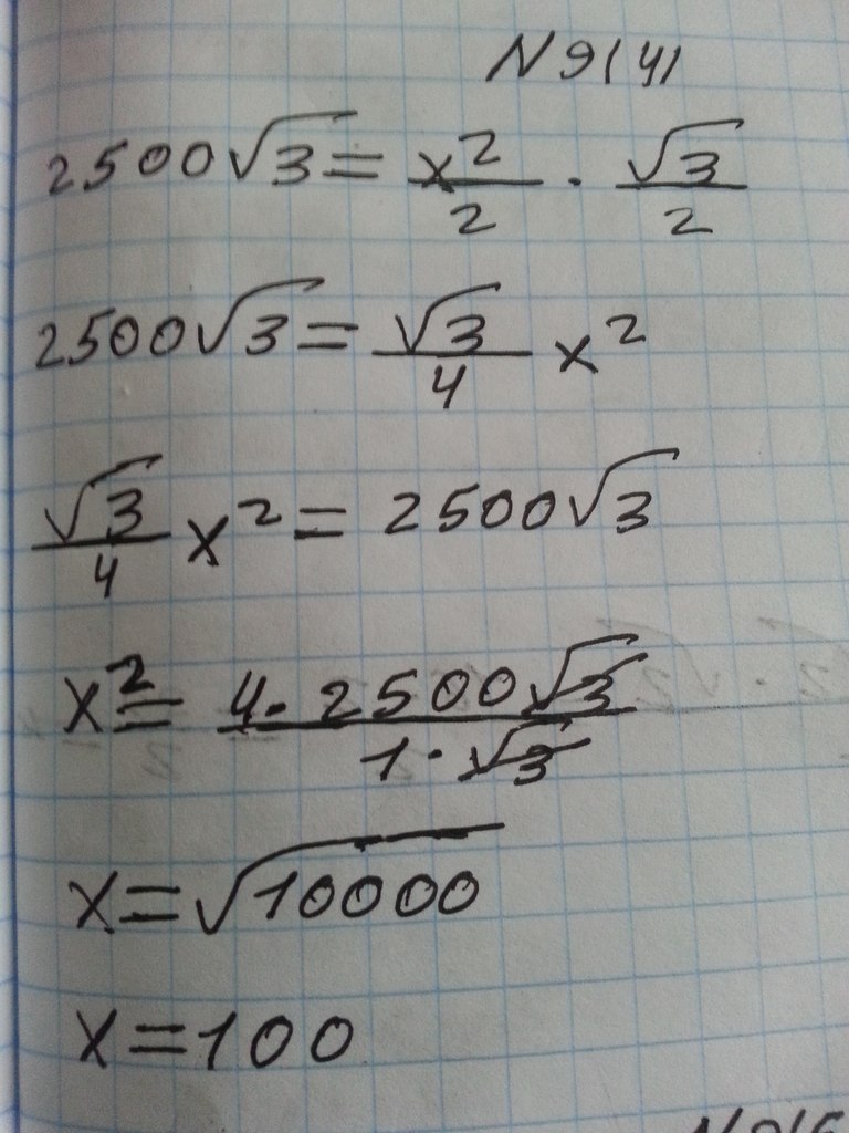 a²=2S/sinβ=2·2500√3/(√3:2)=5000·2√3/√3=5000·2=10000