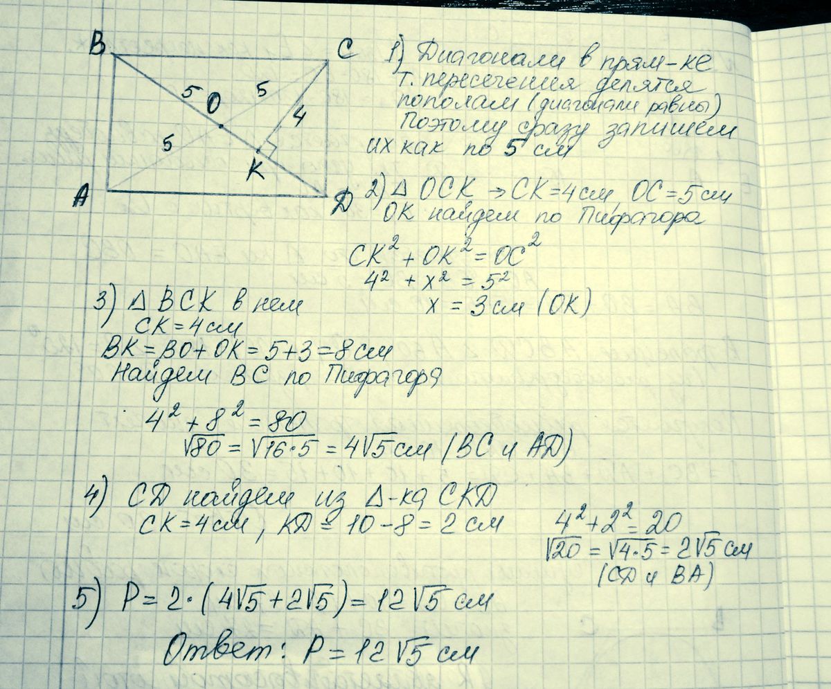 В прямоугольнике ABCD диагональ BD равна 10см.Расстояние от вершины C до BD равно 4см.Найдите периметр ABCD