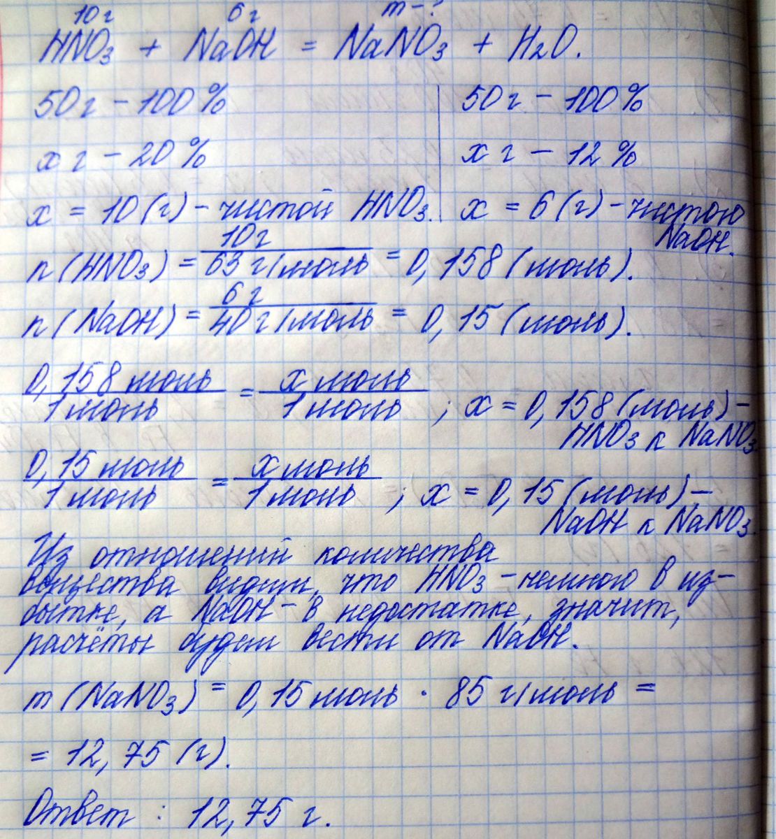 к 50 г 20% раствора азотной кислоты прилили 50 г 12% раствора гидроксида натрия.какова масса образовавшейся соли