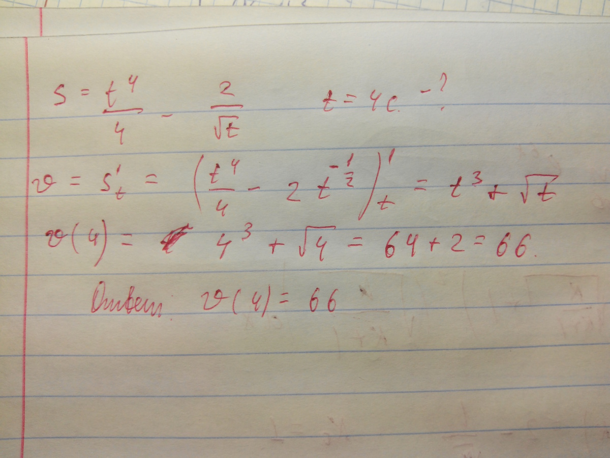 при движении тела по прямой расстояние s от начальной точки меняется по закону s=t^4/4-2/√t. найдите скорость тела через 4 секунды после начала движения