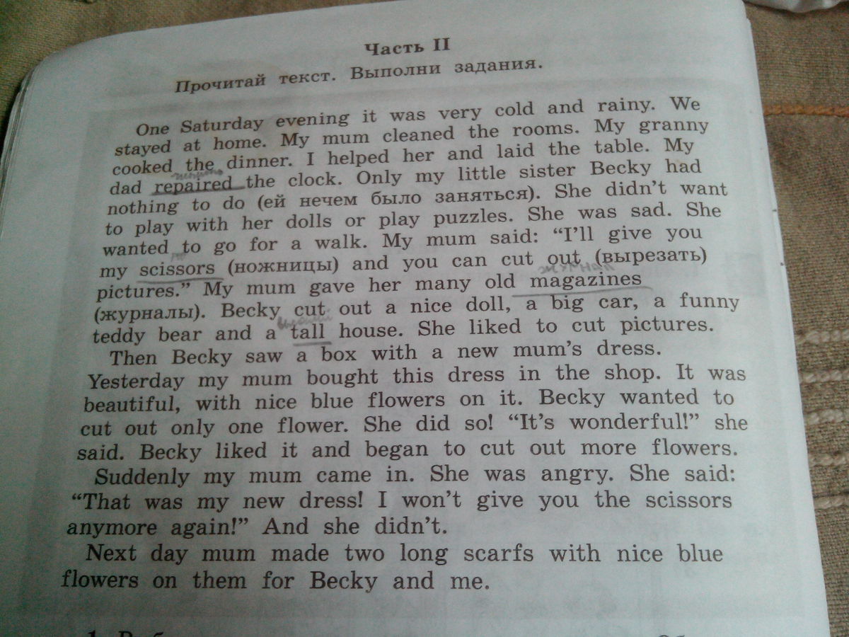 Вечер субботы был холодным и дождливым. Мы сидели дома. Мать убиралась в комнатах, бабушка готовила ужин. Я помогала ей, накрывая на стол. Отец чинил часы. Только моей младшей сестренке Бекки было нечем заняться. Она не хотела играть с куклами или собирать паззлы. Ей было грустно. Она хотела пойти на прогулку. Мать сказала:"Я дам тебе ножницы, а ты повырезай картинки!"Также она дала ей много старых журналов. Бекки вырезала прекрасную куклу, большую машину, забавного медвежонка и высокий дом. Она любит это занятие.