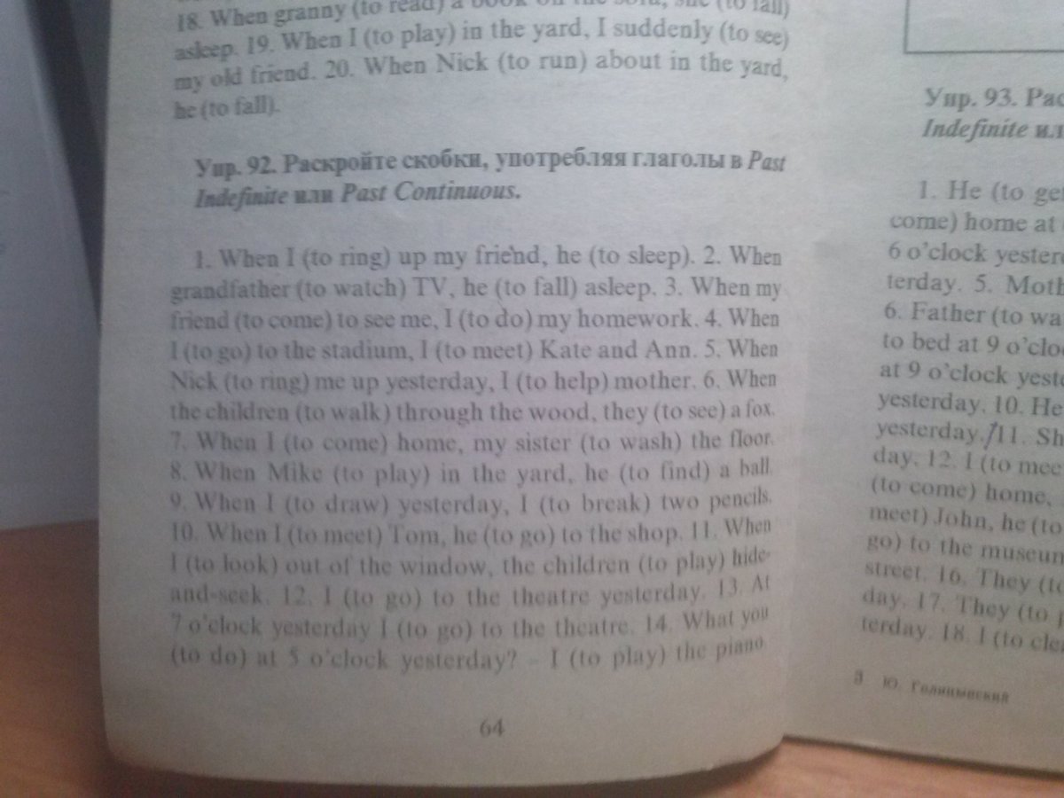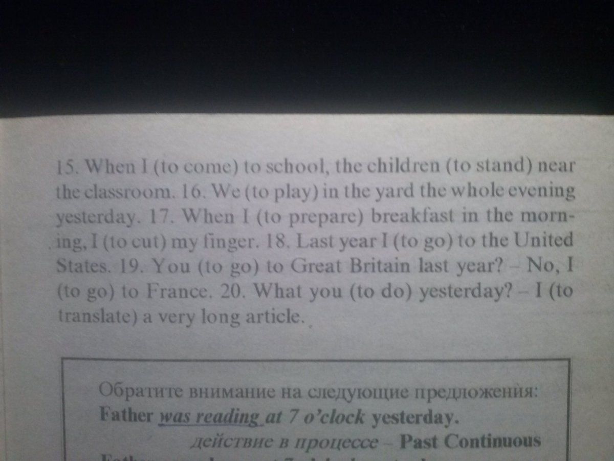 1 rang, was sleeping 2 was watching, fell asleep 3 came, was doing 4 was going, met 5 rang, was helping 6 were walking, saw 7 came, was washing 8 was playing, found 9 was drawing, broke 10 met, was going 11 looked, were playing 12 went 13 was going 14 what were you doing? was playing 15 came, were standing 16 were playing 17 was preparing, cut 18 went 19 Did you go? No, went to France 20 What did you do? I was translating