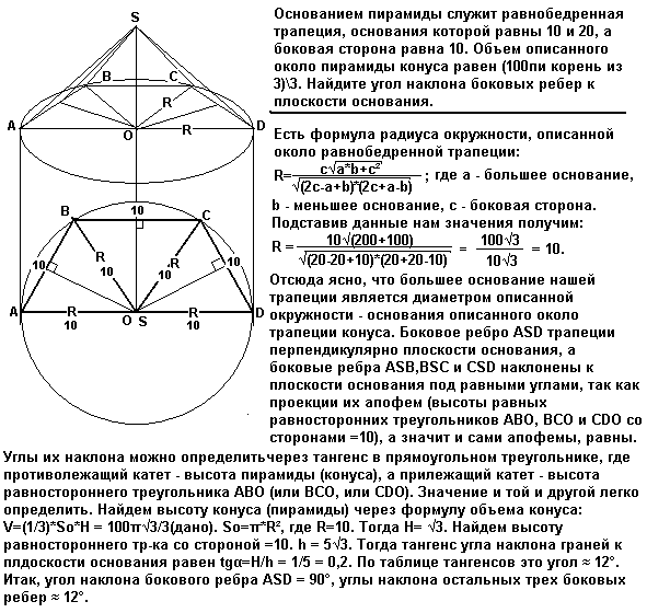 Основанием пирамиды служит равнобедренная трапеция, основания которой равны 10 и 20, а боковая сторона равна 10. Объем описанного около пирамиды конуса равен (100пи корень из 3)3. Найдите угол наклона боковых ребер к плоскости основания.